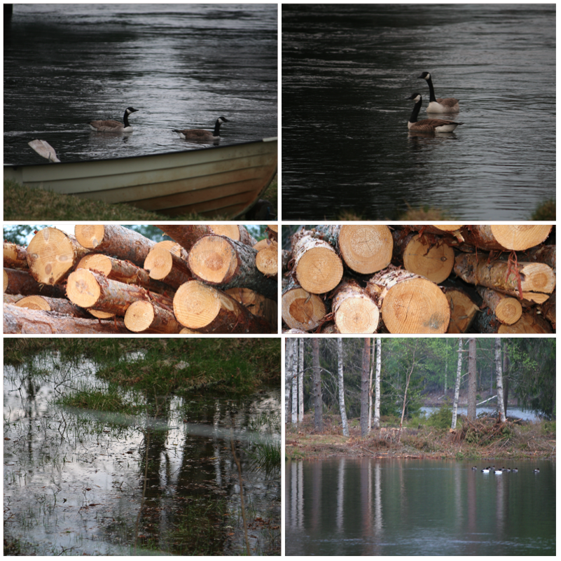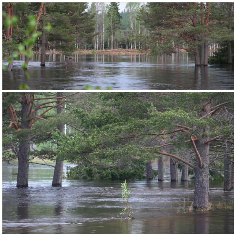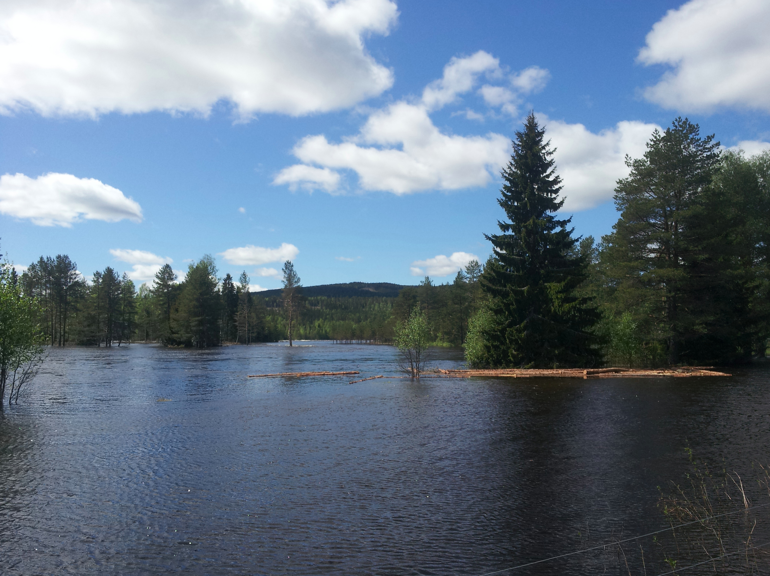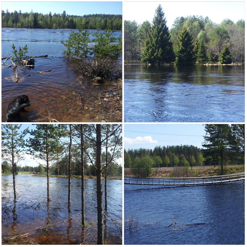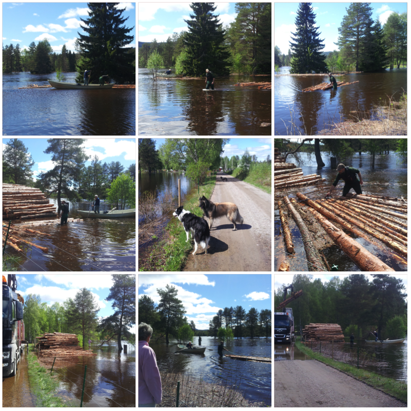 Nedefor bildene fra mandag 26. mai. Nå var vannet svært høy, så høy at de felte trær, som venter i flere måneder på transport, begynte å flyte bort. Det var synd så ringet til transportbedrift og prøve å redde hva kunne ble reddet. Vannet var forresten kjempekald!