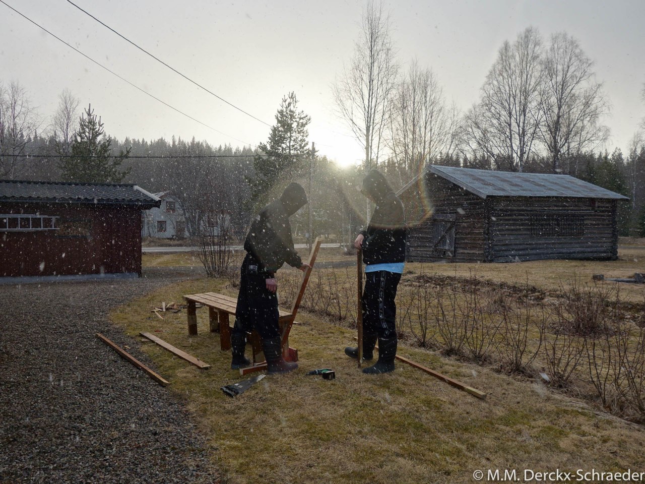 Og da blir det skapet en benk fra tre fra en liten uthus, som vi fjernet tideligere: